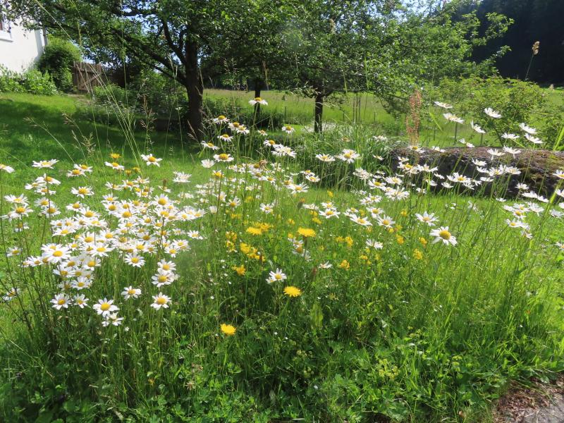 Margeriten vor Wein und Pflaumenbaum, die Kaki in der Mitte treibt neu aus.