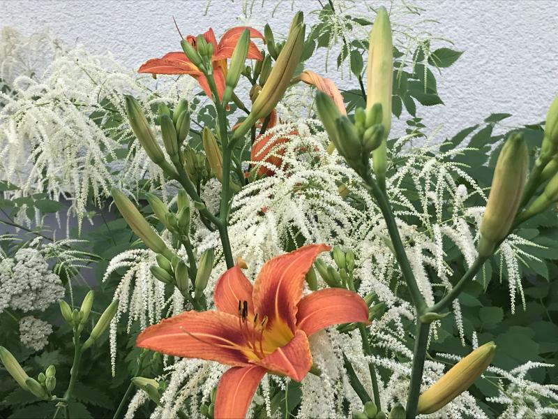 Steinerne Mauer im Rücken, ich lege mit Steintreppe an....im Beet Persicaria, Heuchera, in Töpfen Coreopsis, einjährige Verbenen, Gießkannen :)