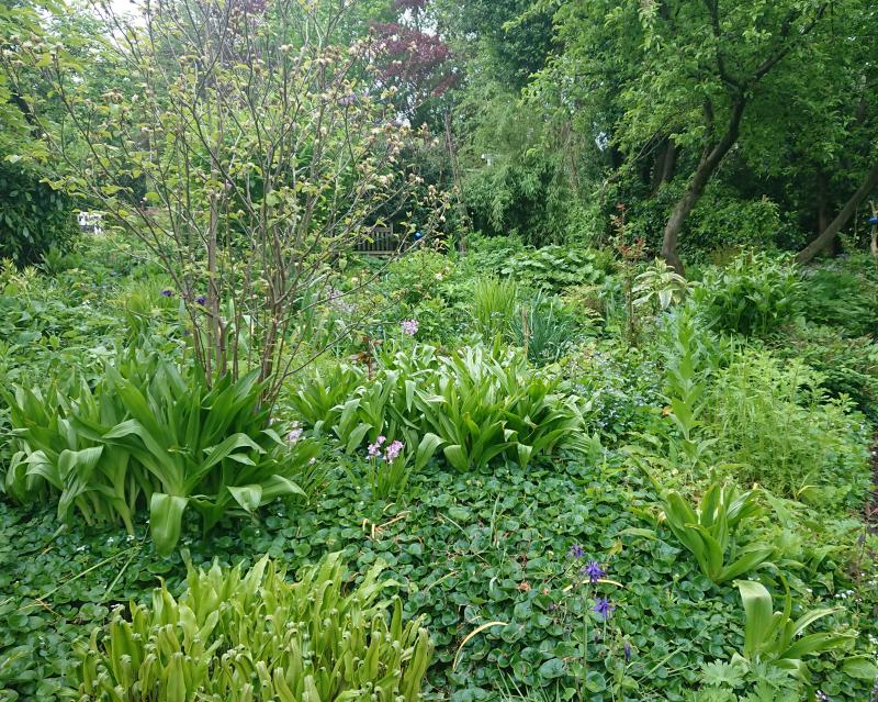 Panaschierte Symphytum im Mittelgrund rechts, Haselwurz, Hirschzungen, Fothergilla, Herbstzeitlosen und und und.