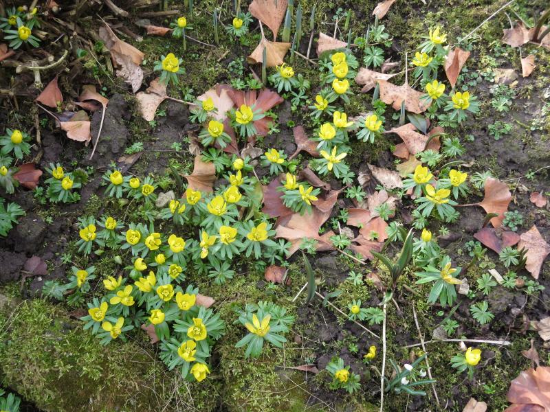 Eranthis, Galanthus, Helleborus, Hamamelis... und Bank mit Kugeln
