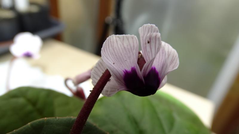 Die Blüte. Ich denke die Maserung ist gut und der Blütenmund ist sehr dunkel. Wahrscheinlich Cyclamen coum f. pallidum ‘Carol’s Hope’