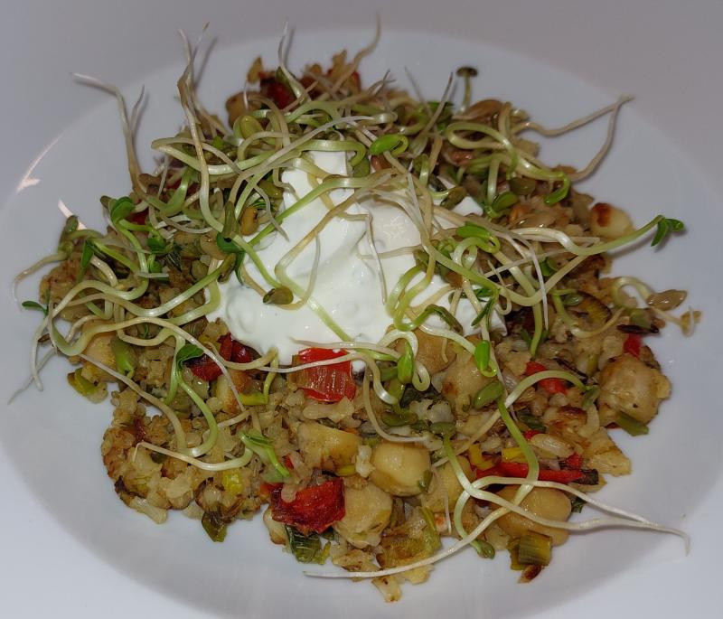 Gebratener Reis mit Porree, Paprika, Kichererbsen und Halloumi, Bockshornkleesprossen