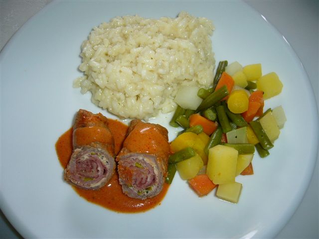 Heute gab es:KarottensalatFleischröllchen mit Schinken an PaprikasauceWeissweinrisotoGemüse