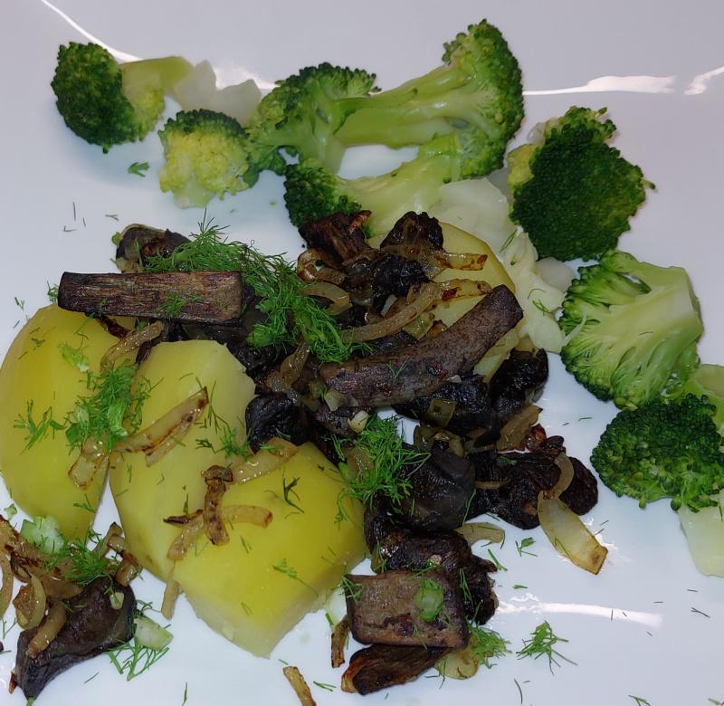 Kartoffeln mit gebratenen Rotkappen und Zwiebeln, Brokkoli, Endivien