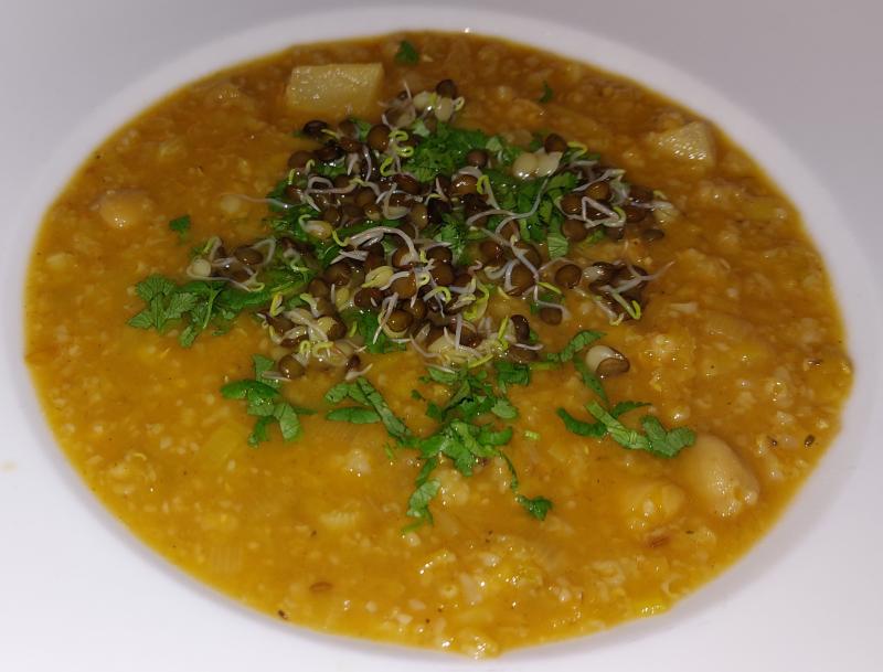 Rote Linsensuppe mit Reis, Porree, Sellerie, Kokosmilch und vielen Gewürzen, Linsensprossen und frischem Koriander