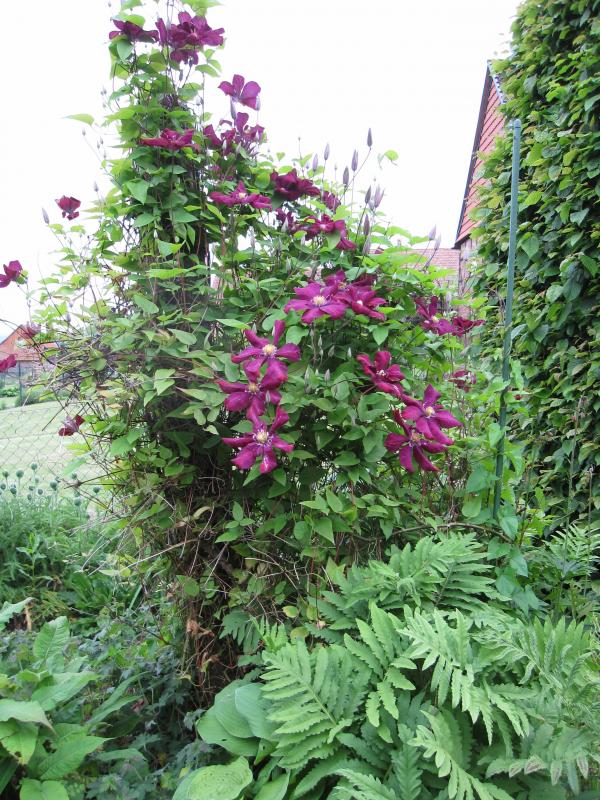 Clematis Rouge Cardinal an einem grauen Tag; Farn, Hosta, Türkenmohn