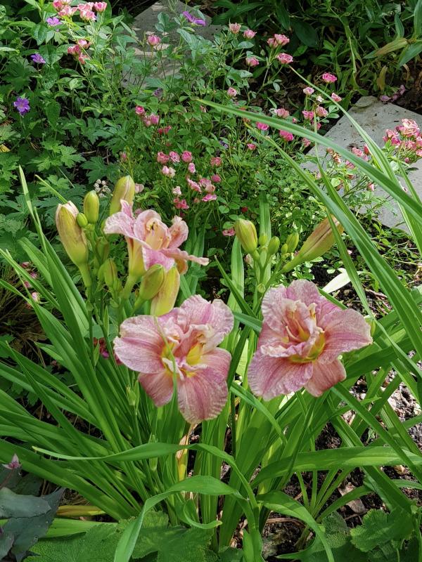 Taglilie Spotted Fever mit Minirose, Geranium, links unten noch ein Sedumblatt