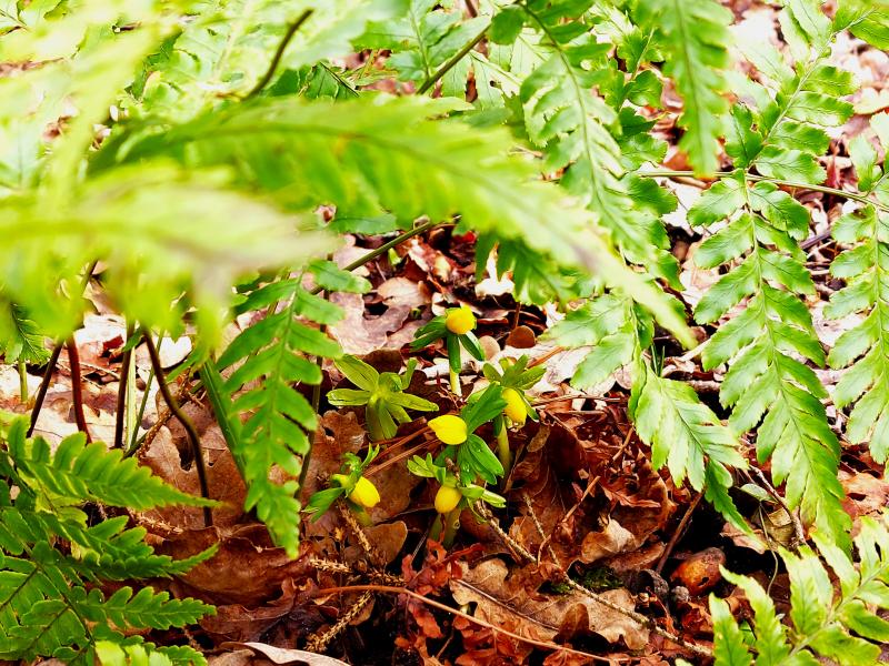 Eranthisreturn aus Bremen, hier unter schützenden Farnwedelbaldachin des Rotschleierfarns.