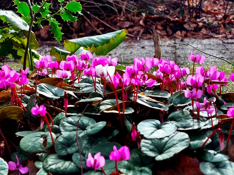 Rosa Blütenwolken in vielen Gartenecken - cyclamen coum.