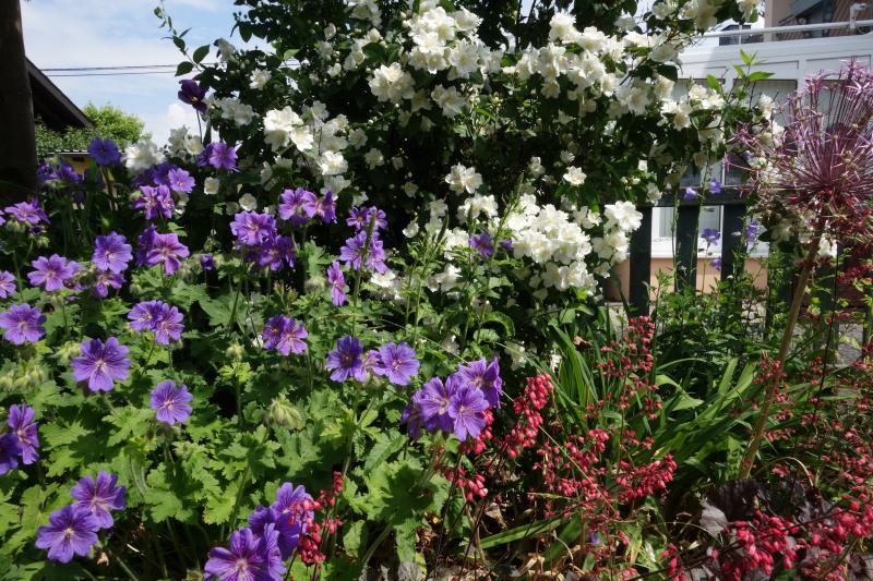 Anderes Geranium, mit Philadelphus, Heuchera, Allium