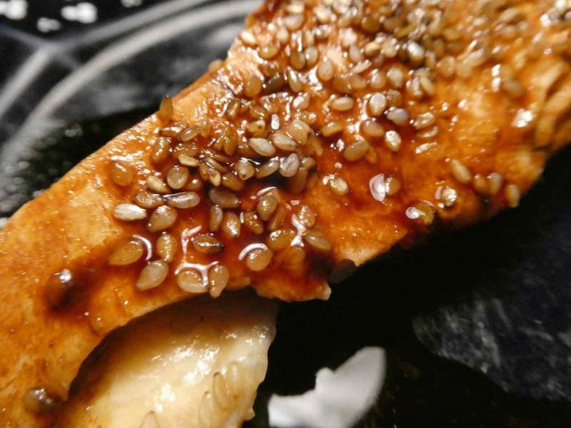 Der Lachs wurde asiatisch mit Teriyakisoße und Ingwer mariniert und mit Sesam gedämpft.