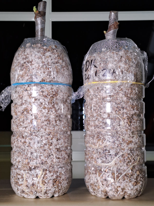 Am 20.1. wiederum 2x DK sowie 2x HC in Perlite+Vermiculite gestartet. 2x in transparente 1-Liter Flaschen aus Plastik sowie 2x in 1-Liter Tetra-Paks (oben abgeschnitten). Zusätzlich einen Tag später 2x DK als Figpops im gleichen Substrat. Heute bin ich nach 4-tägiger Abwesenheit wieder zuhause und nachdem am Mittwoch noch überhaupt nichts zu sehen war, sehe ich heute (nach nur 3 Wochen) bei beiden Figpops sowie beiden transparenten Plastikflaschen sehr schöne Wurzeln (siehe Foto: links HC rechts DK). Deutlich schneller als erwartet und somit ist Perlite+Vermiculite bisheriger Rekordhalter, was die Bewurzelungsgeschwindigkeit angeht. Die DK scheint die unteren 2/3 des 1-Liter-Volumens weitgehend durchwurzelt zu haben, bei nahezu null Austrieb. Wahnsinn!