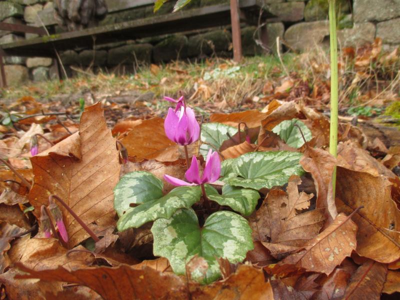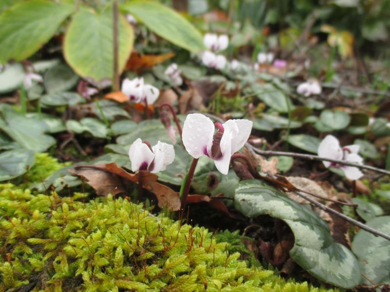 Dafür etablieren sich die Cyclamen coum. Aus anfänglich drei Pflanzen bildet sich nach und nach ein Teppich.