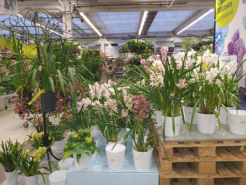 Aber Blume2000! Heute gesehen, das dort kräftige 1-Meter-Cymbidien mit drei Blütenstielen für 25€ angeboten werden. Die Blüten duften nicht.