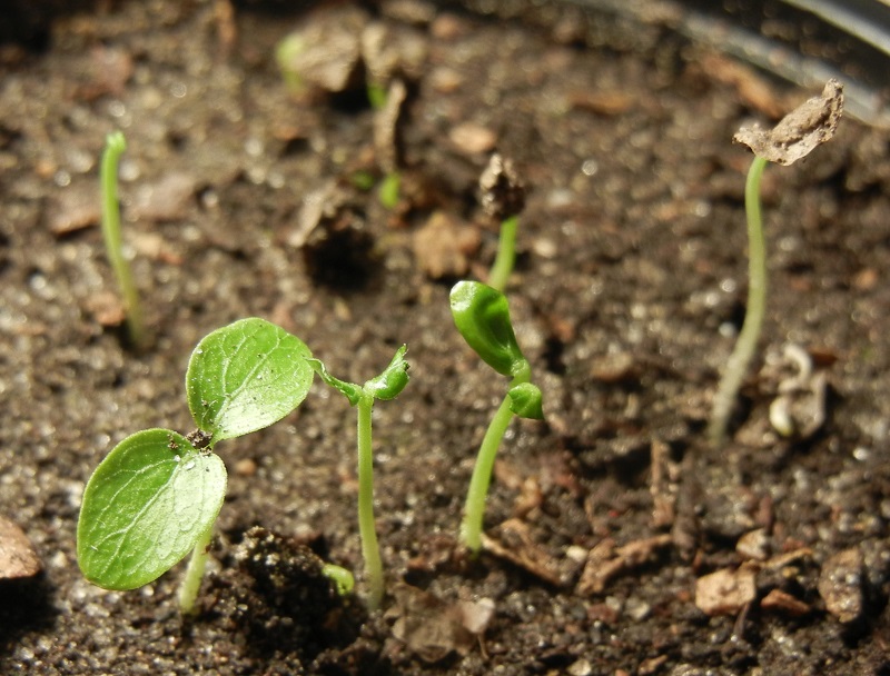 Ich habe nur fertile Samen ausgesät (erkennbar daran, dass sie dick sind und ein positives Ergebnis im Schnitt-Test ergaben). Die Keimquote ist sehr gut. Leider habe ich sie wohl zu flach mit Erde bedeckt, sodass die meisten Sämlinge ihre "Samenschale" mit aus der Erde gehoben haben (siehe ganz rechts auf dem Foto). Die ist dann so trocken und hart, dass die Keimblätter sich nicht befreien können. Beim Versuch, sie mit einer Pinzette zu entfernen, brauchen mir die Blättchen ab (2 vorne). Der linke Keimling hat sich aber gut befreit.