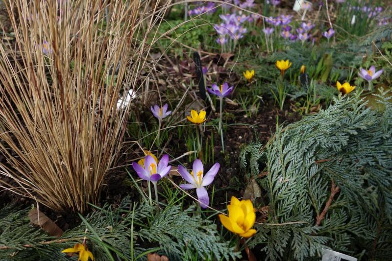 Bislang ist das wirklich kein ideales Crocus-Jahr. Es ist warm und nass und grau. Die jetzt blühenden Crocusse schießen bei dem warmen, feuchten Wetter in die Höhe. Viele kippen schwer vom Regen einfach um, noch bevor sie sich auch nur einmal geöffnet haben.