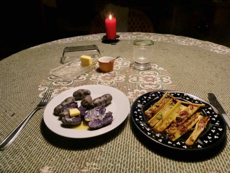 Gestern gab es Hähnchenkeule aus dem Ofen, in Butter geschwenkte Pellkartoffeln und einen köstlichen Fenchel-Raddicchiosalat.