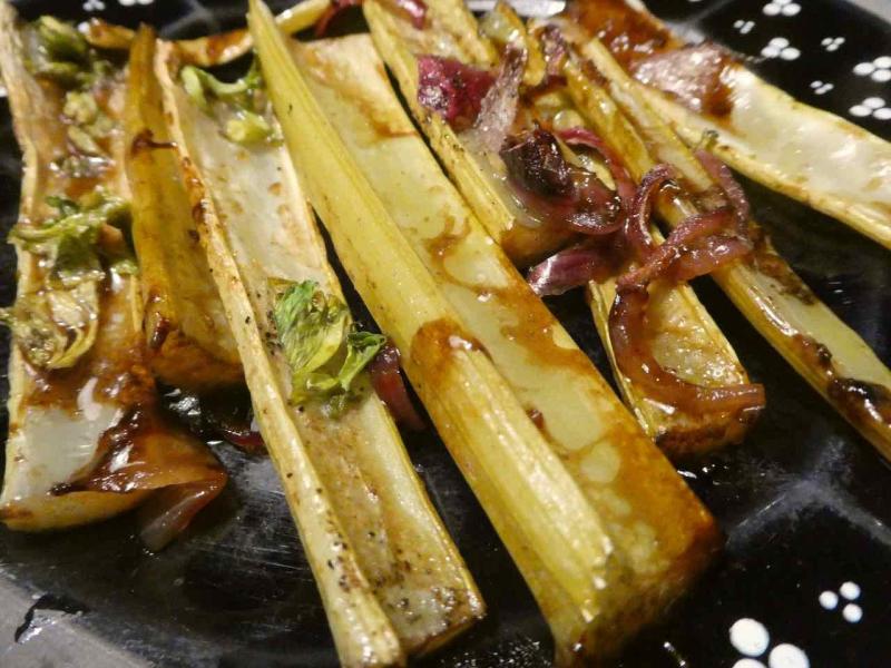Den Sellerie habe ich in pfannengroße Stücke geschnitten, rote Zwiebel mit Olivenöl angeschwitzt und mit Gemüsebrühe und etwas Balsamicocreme abgelöscht, dann den Sellerie im Backofen 25 Minuten bei 180°C gebacken.