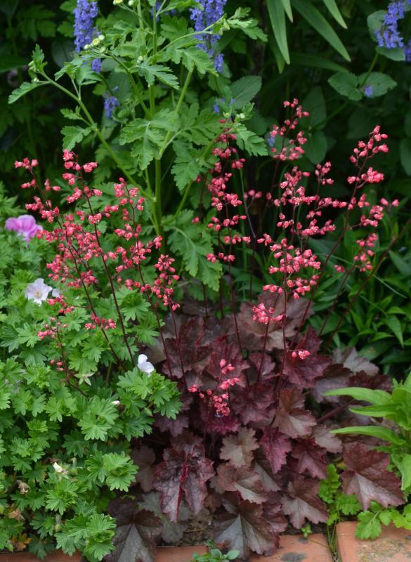 Dann lege ich mal Heuchera an, mit Geranium, Veronica, Mutterkraut.