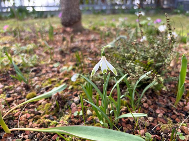 Ein gefülltes Glöckchen unter der Korkenzieherhasel. Das Laub bleibt immer liegen. Hat sich gut vermehrt. :)