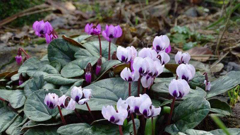 Cyclamen coum, Sämling vor Wegeinfassung.