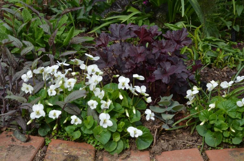 Außerdem noch mit dabei: Heuchera, links Campanula punctata und Stachys, ganz hinten ganz wenig Lunaria 'Chedglow', Sedum-Sämling