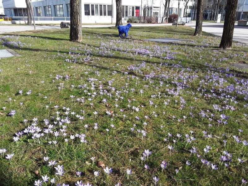 Bei kühlem und regnerischem Wetter sind jetzt noch Krokusse und kleine gelbe Narzissen in der Wiese/Rasen aufgeblüht.