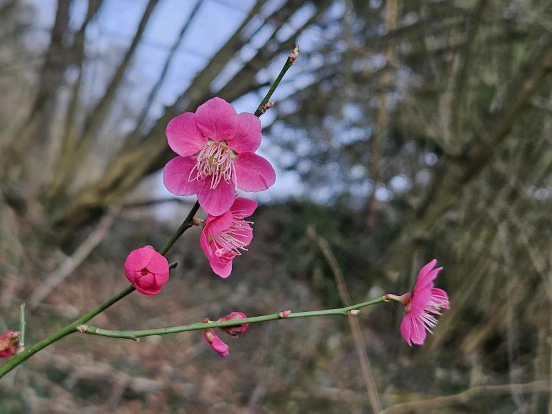 dem allen zum Trotz blüht Prunus mume Beni-chidori im Kübel am Kompostplatz.