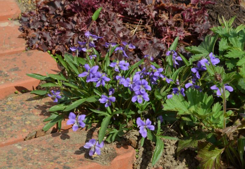 Dazu Heuchera, Laub von Monarda, versteckt dahinter weiße Pfingstveilchen.