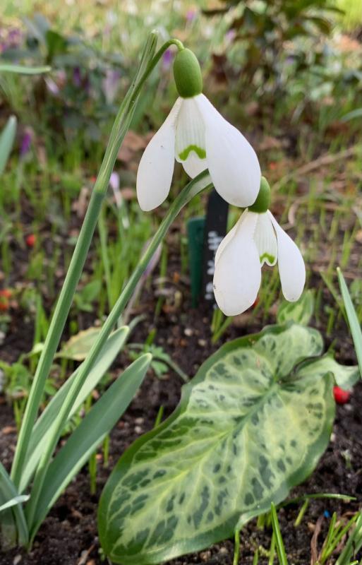 Galanthus ‚Berliner Kaiser‘ mit Arum italicum ex R. Nutt. Der Arum hat im vergangenen Jahr geblüht und Samen ausgebildet. Auf die Sämlinge bin ich schon gespannt. ‚Berliner Kaiser‘ ist ein Imperati, duftet und ist recht groß.