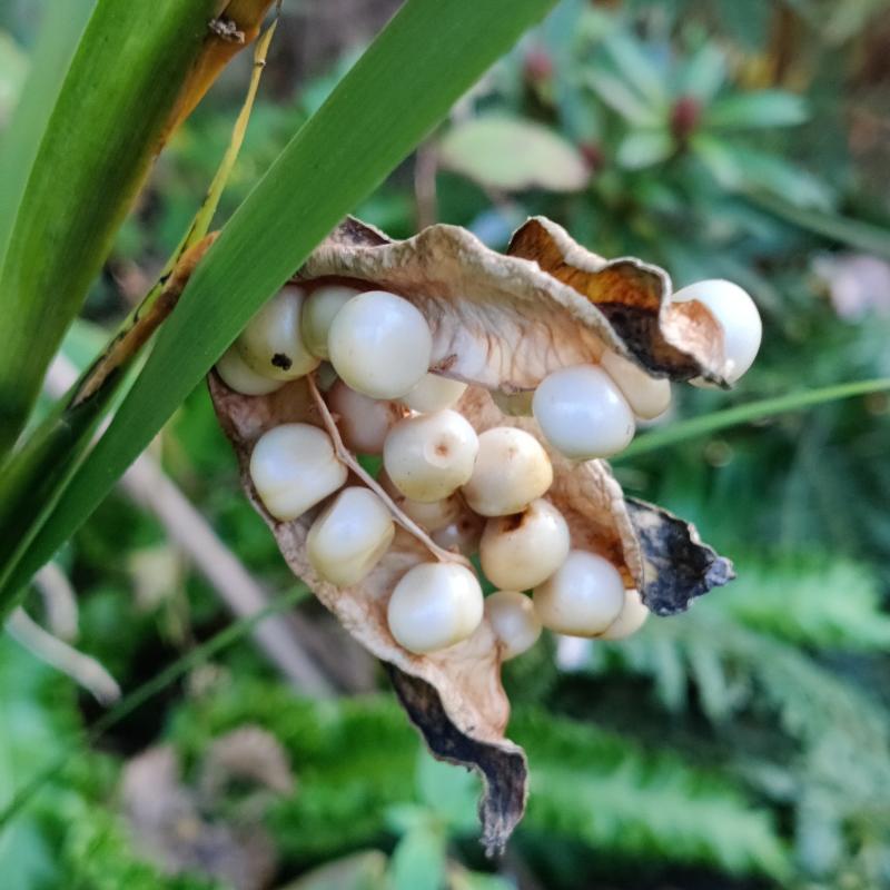 Iris foetidissima 'Fructo Alba' hat nach einigen Jahren zum ersten Mal Samenkapsel und die Samen sind tatsächlich weiß. :)
