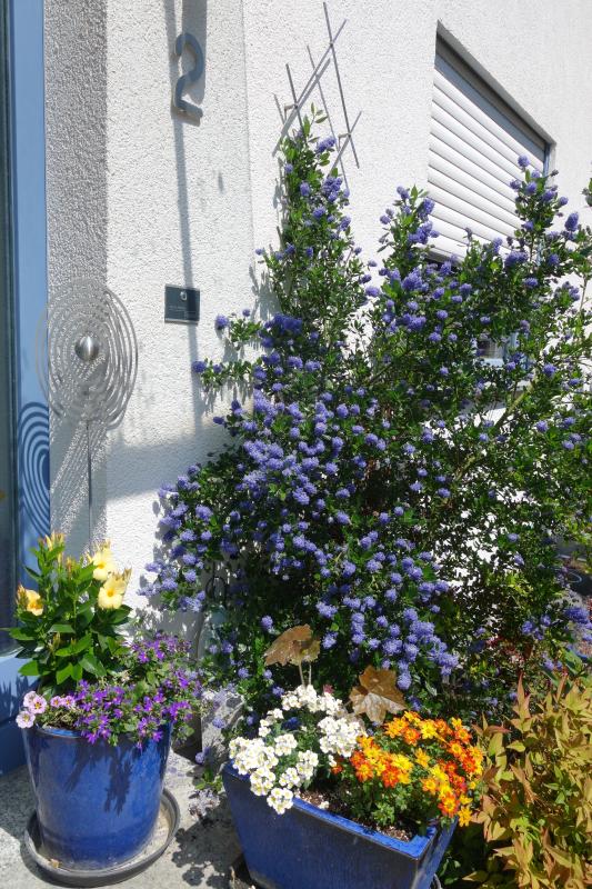 Ganz andere Idee: Ich habe auf der anderen Seite des Eingangs vor 2 Jahren eine Ceanothus 'Viktoria' gepflanzt, und bin bislang begeistert. Immergrün, tolle Blüte. Das müsste bei dir doch eigentlich auch gehen. Ich habe sie allerdings etwas an einem kleinen Spalier angebunden. Das kann man aber sicher auch anders lösen.