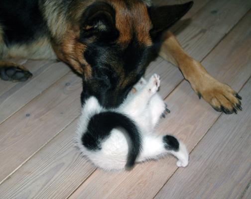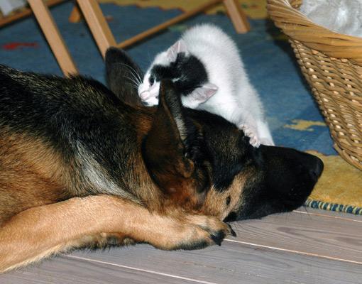 Das ging eine ganze Weile so, ein ausgiebiges Spiel, nach der die kleine Katze auf der einen Seite sich sehnte... und die Hündin auf der anderen.Natürlich mußte ich das immer bremsen, schließlich war es ein Katzenbaby, das auch Schlaf brauchte. Aber es war auch schön - das Baby hatte eine Beschäftigung und hing demzufolge nicht in meinen Gardinen...