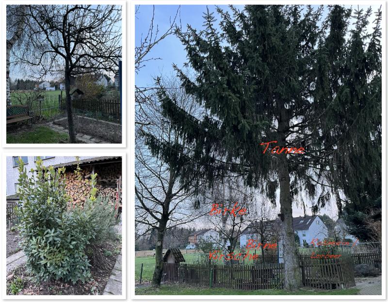 Ich fände ein paar Fotos hilfreich, um z.B. die Größe der Bäume zu sehen. Ist die Kirsche eine mächtige Süßkirsche oder eine zierliche Sauerkirsche? Wie groß ist die Tanne - oder ist es eine Fichte?