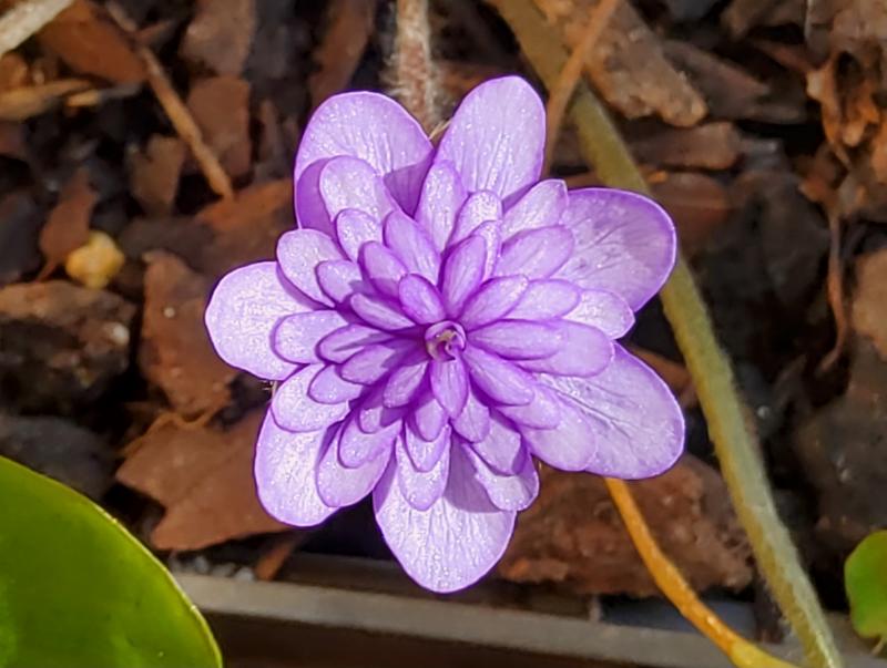Grünes Laub und das blau ist völlig falsch am Foto. Sie heißt ‚Dark Dimension‘ und ist tiefdunkelviolett. ;)