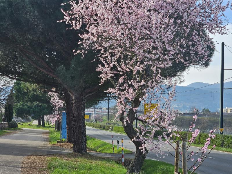 Dieses Jahr sind wir gleichauf. Soweit ist die Mandel hier auch - fast zwei Wochen zu früh. Die ungewöhnliche Februarwärme dieses Jahr hat sie viel zu zeitig aufblühen lassen.