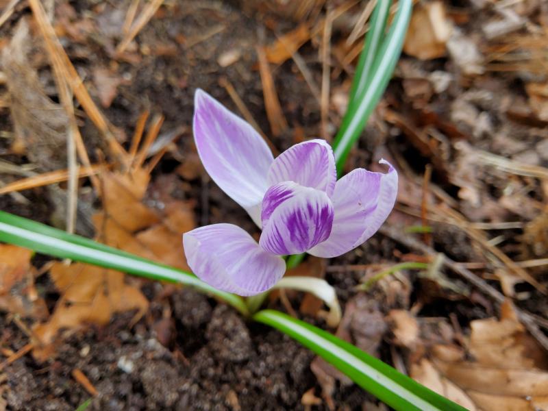 Hier ist noch ein kleiner aufgetaucht, ich schätze eine Hybride aus normalem Tommi und einem gestreiften C. vernus, den es hier in diversen Varianten gibt. Blütengröße etwa wie bei den Elfen, innen zartflieder gestreift, von außen sind die 3 äußeren Petalen weiß, die inneren kräftig violett gestreift. Mal gucken, wie der sich so macht ...