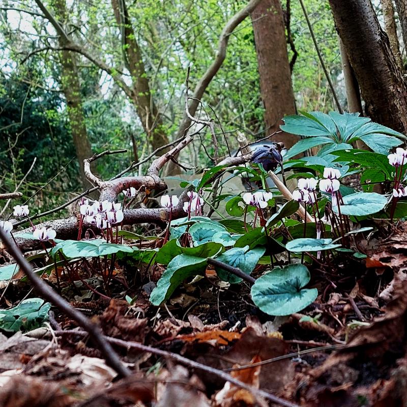 Geschützt unter Hecken halten einige Cyclamenpulks blühend mehrere Wochen von Januar bis März durch.