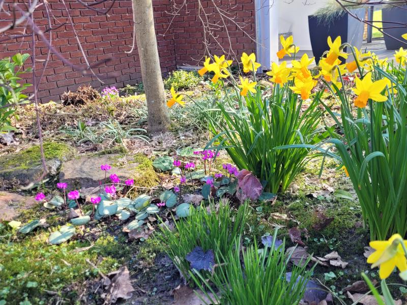 Schöne, leuchtende Narzissenbeete bei Dir, Buddelkönigin - hier blühen bislang nur die kleineren Formen, im Bild Tete - a - Tete ( glaub' ich )
