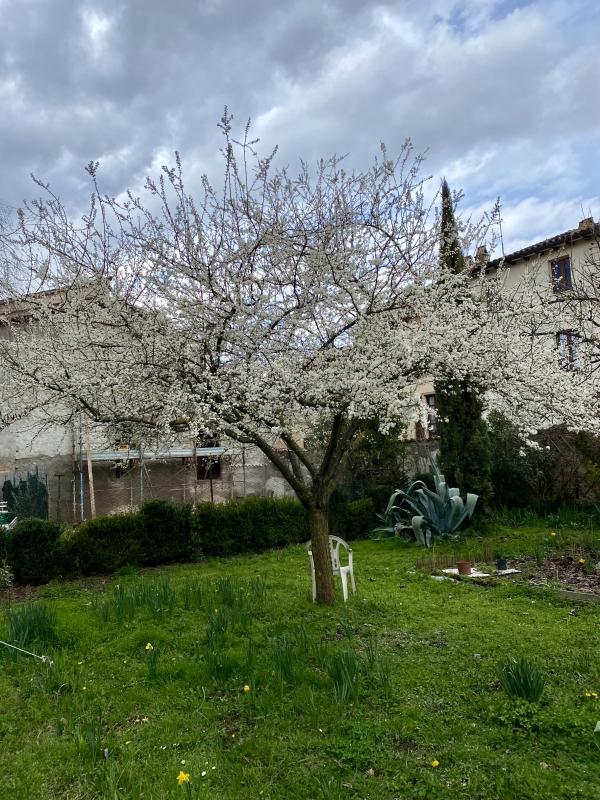 Die Kirschpflaume blüht und wird von unzähligen Bienen umschwirrt.
