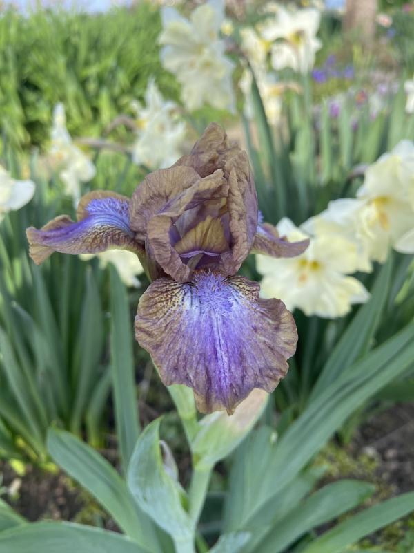 Einige der im letzten Jahr getopften Iris standen wegen der Schneckeninvasion im Gewächshaus, Oddbod erfreut mit der 1. Blüte