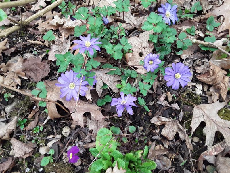 Hier blüht Anemone blanda in diesem Jahr sehr unterschiedlich. Die ersten verblühen bereits, während andere kaum aus dem Boden sind. Diese eher dunkle ist jedenfalls ganz hübsch.