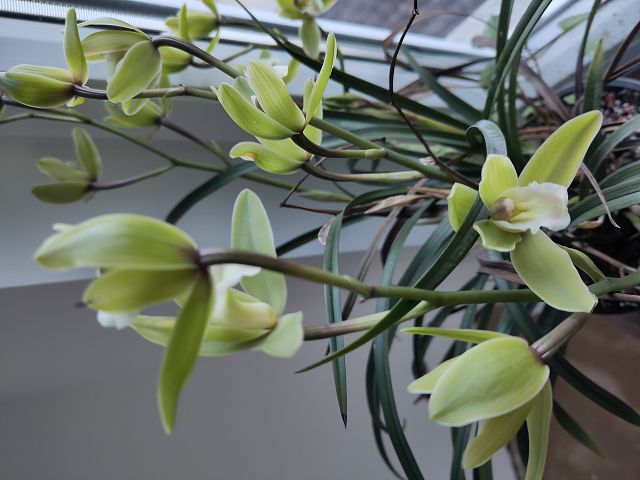 Jetzt ganz aufgeblüht: der Coelogyne gefällt es unter dem großen Dachfenster.
