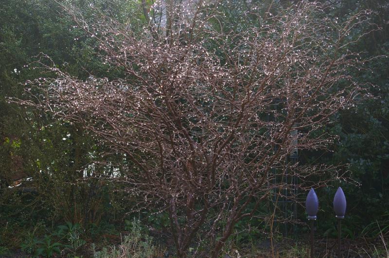 Prunus incisa kojou-no- mai im Februar nach dem Regen.
