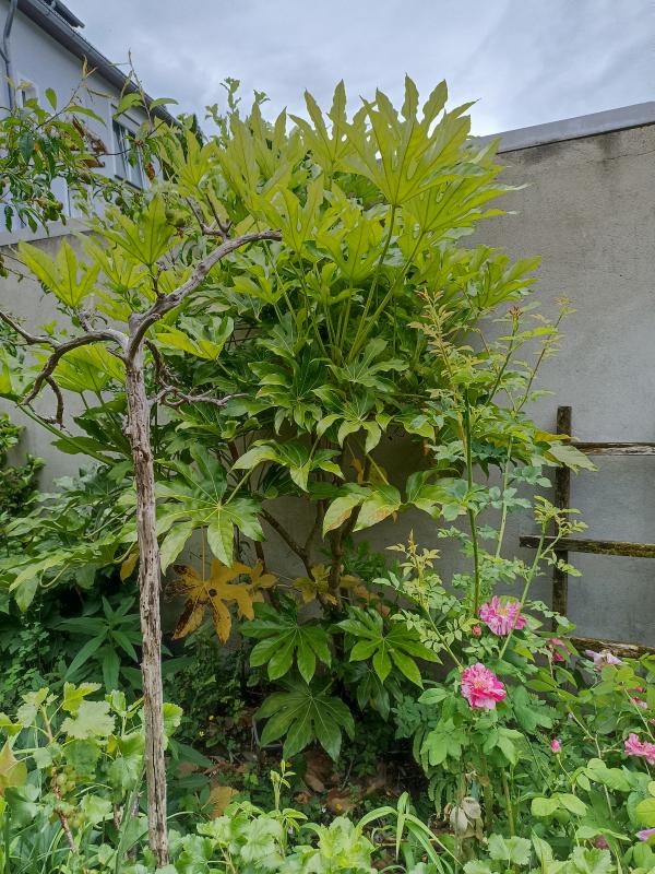 Die kleine Fatsia aus der Baumarkt hat in der komplett dunkle und kalte Laube auch gut überwintert, und seit april ausgepflanzt. Mal sehen wie es den Winter meistert.