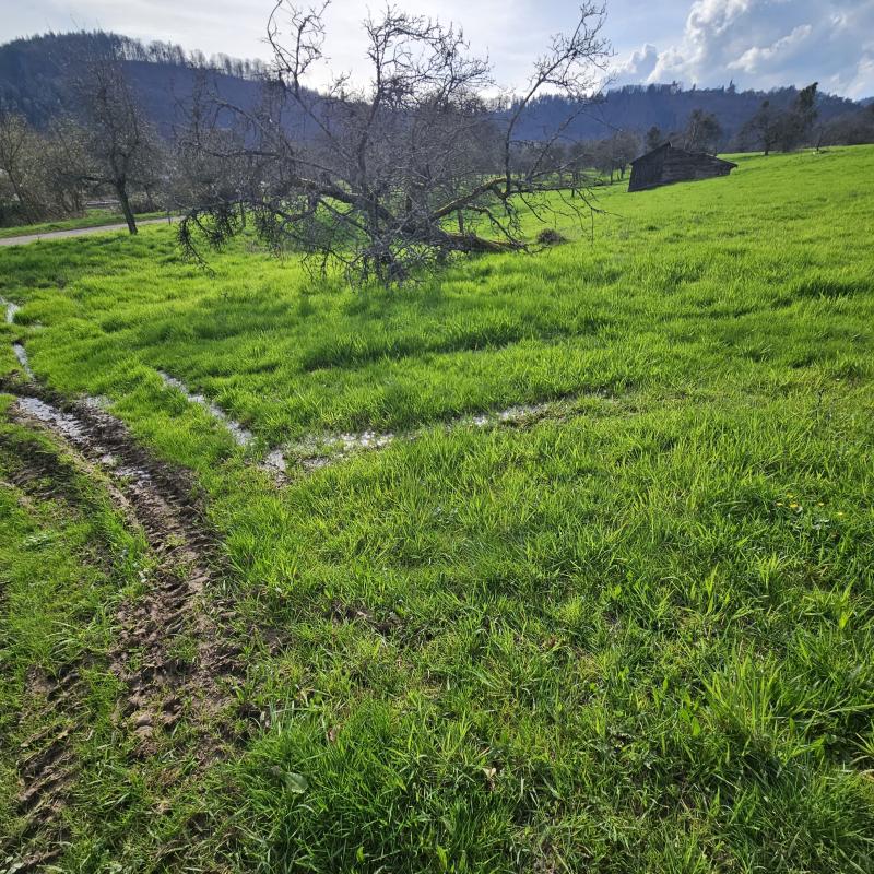 in der Wiese auf der oberen Terrasse dasselbe, auch dort hat ein Fahrzeug Spuren hinterlassen. Die Wiese unter Wasser.