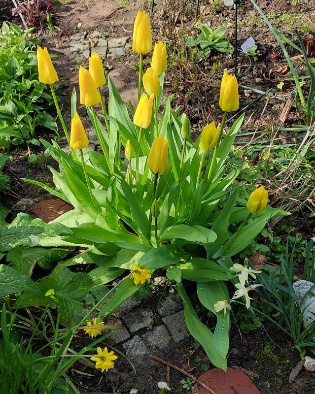 Ganz einfache, bescheidene gelbe Tulpen. Die stehen hier schon ca. seit 20 Jahren. Waren aus einem Ostergesteck. Immer wieder schön zum Anschauen.