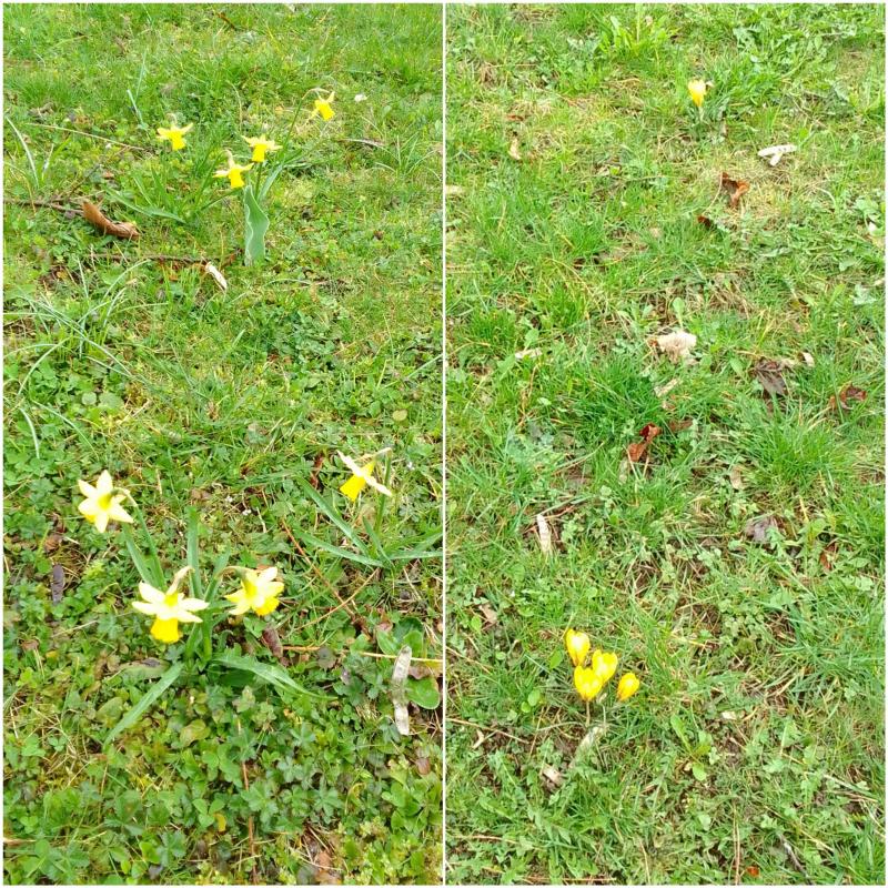 Bei kühlem und regnerischem Wetter sind jetzt noch Krokusse und kleine gelbe Narzissen in der Wiese/Rasen aufgeblüht.