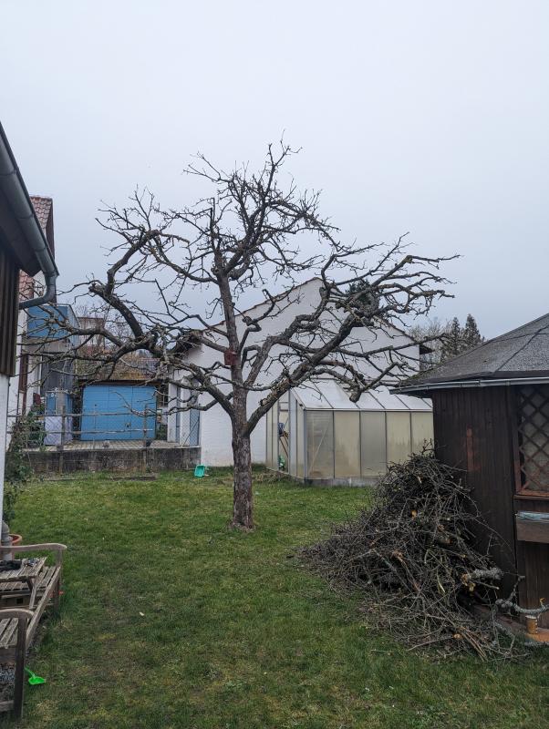 Mir ging auch tatsächlich dieses Jahr darum der Baum zu begrenzen, mittlerweile müsste man sich bücken um drunter zu laufen und er war schon sehr breit geworden. Dazu wurde mir auch empfohlen die Äste, die so schwach aussehen zu entlasten. Deswegen habe ich einiges seitlich abgekürzt (sonst kommen die Äpfel und die Äste hängen sehr tief runter)