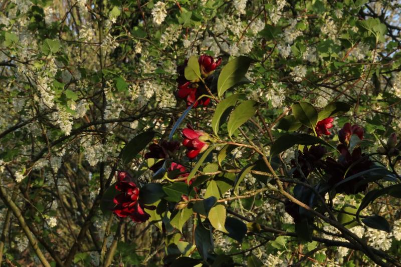 Camellia japonica ´Kuro Tsubaki´ mit Ribes ´White Icicle´ im Hintergrund.